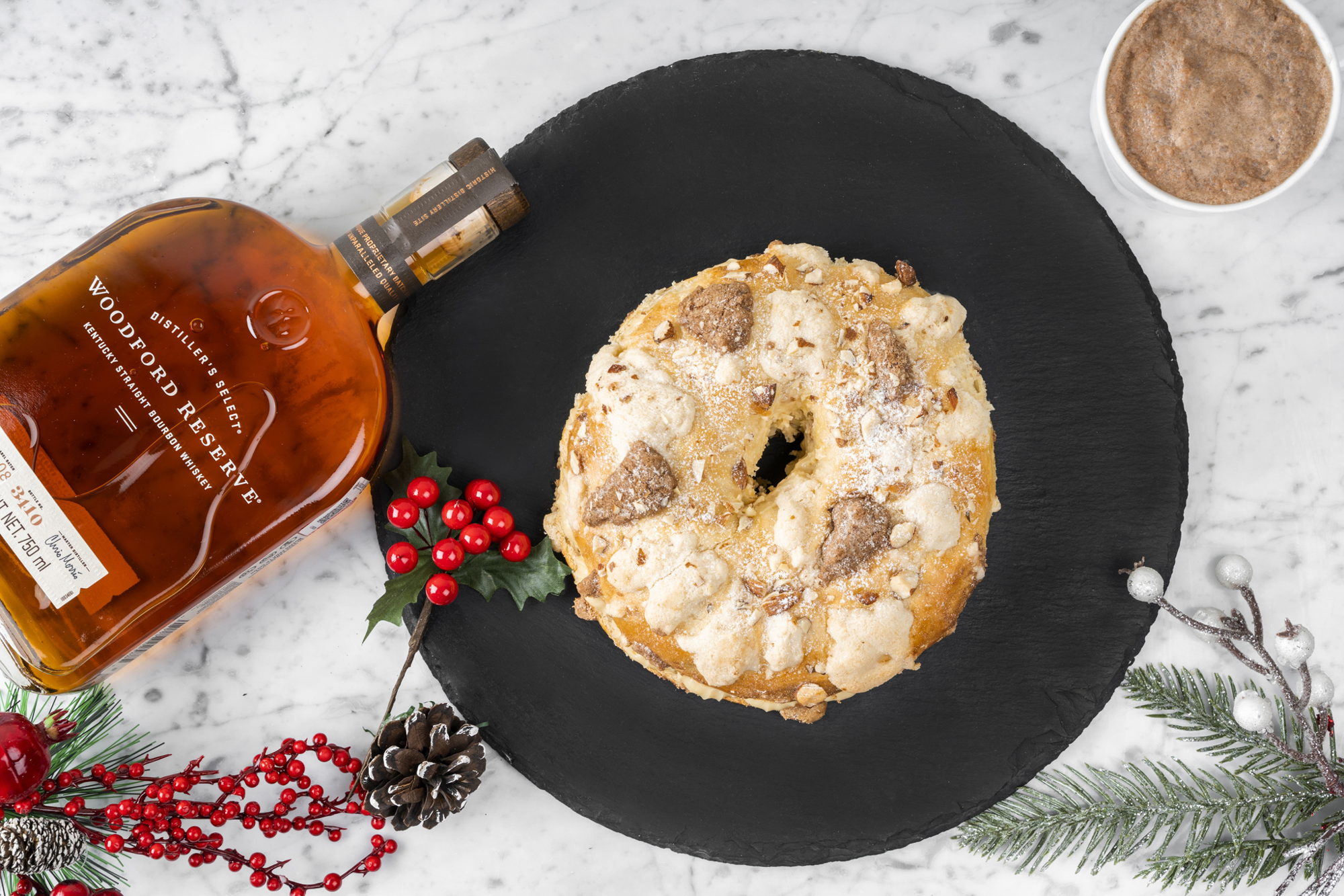 La primera creación está inspirada en las especias de Woodford Reserve como canela, anís, café y nuez moscada, que dan como resultado una deliciosa rosca con almendras y naranja cristalizada, la cual lleva un relleno de franchipán infusionado con este Bourbon.
